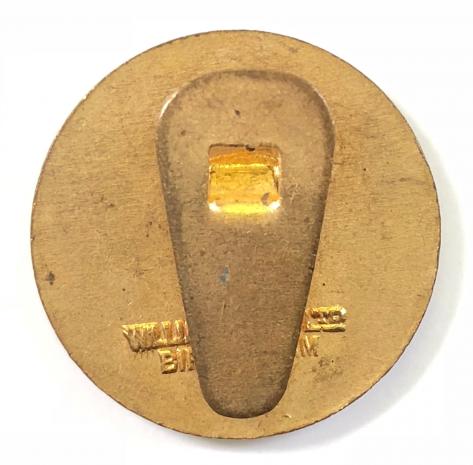 A very good original example of a circa 1950's 'Holiday Camp Douglas membership lapel badge' in gilded brass with blue enamel title surround, depicting a white enamel campers bell tent to the centre which bears the ancient 'Triskele' symbol, the reverse impressed with unusual maker's details 'William White Ltd Birmingham'. Excellent condition, complete with original buttonhole fitting, enamel perfect, gilt finish remains bright.