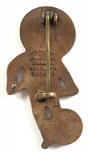 A very rare original pre-war circa 1937 first pattern 'Robertson's Footballer Golly badge', displaying white hands and black feet and wearing a yellow V-neck waistcoat displaying the advertising slogan 'Golden Shred' and kicking a pale blue and claret ball; the reverse stamped in relief with a "REGd APPd 808442" a Registration, Design and Patent for the year 1937 and with maker's details "H.W.Miller Branston St B'Ham.18". Condition: enamel loss to both legs, nick to right side tip of coat, scatch marks to head, retaining original coiled pin fitting and hook catch.