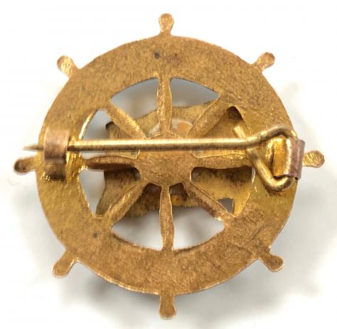 A scarce original circa 1967 to 1976 period 'Normandy Ferries gilt ships wheel souvenir badge', displaying the joint organisations split flag, a Dragon on black enamel for the Peninsular & Oriental Steam Navigation Company and a Leopard on red enamel for the French company 'Societe Anonyme de Gerame et d'Armencent'. Very good condition, complete with original pin fittings, enamel perfect, gilt finish remains bright.