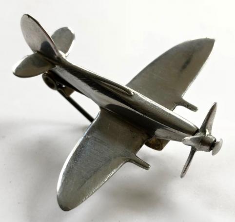 An exceptionally fine original circa 1944 period polished aluminium example skillfully made in the form of a large Royal Air Force late MK Spitfire badge featuring a four bladed revolving propeller. Very good condition,