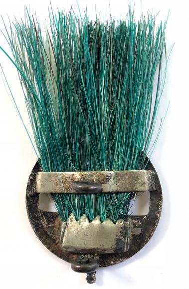 A scarce original second issue 'Rover Scoutmaster Officer's hat badge' unmarked nickel silver plated arrowhead in circle, red enamel 'R.S.' instead of stars, 'Boy Scouts' motto scroll below, the reverse with open back fitting. Fair to good condition, complete with sparse green bristle plume, correct amount of bobbles top and bottom, two rounded loops, service wear.