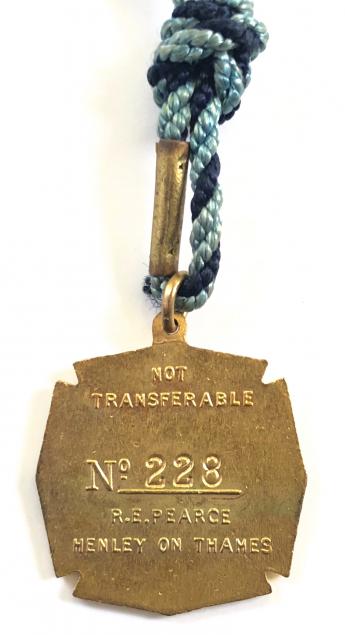 A rare original '1955 Henley Royal Regatta gilt and enamel badge', the reverse with maker's details 'R.E.Pearce Henley-on-Thames' 'Not Transferable' and official issue number '228'. Very good condition, enamel perfect and complete with original cord.