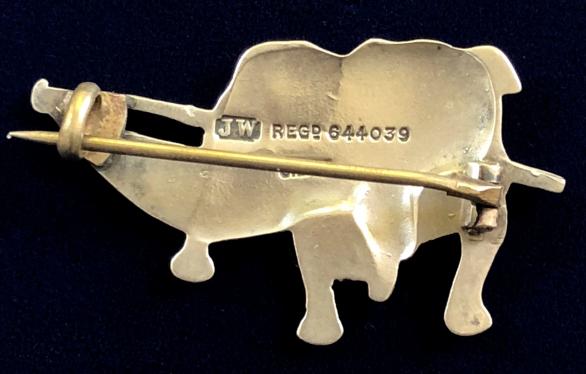 A rare original First World War period patriotic badge, in the form of a defiant British Bulldog standing proud with red, white and blue enamelled 'Union Flag' between his teeth; the reverse impressed 'Silver', maker's details 'JW' and 'REGd 644039' a Registered Design and Patent Date for 1915. Very good condition, complete with original pin fittings and old replacement hook, enamel with minor service wear.