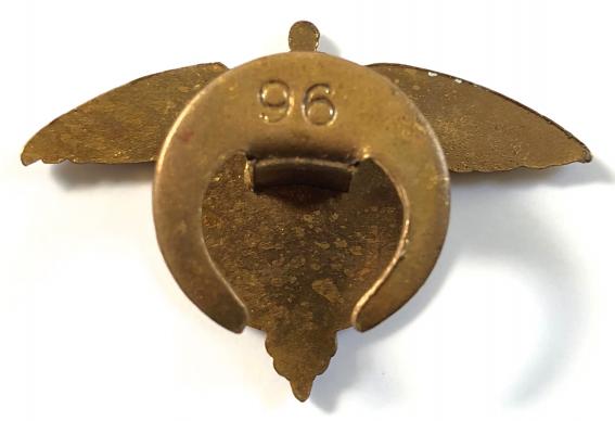 A rare original wartime period home front gilt badge in the form of a white enamel title strap 'Frank Hawtin', the centre depicting a pair of finely feathered wings issuing from a lion's head on blue enamel ground; the reverse with maker's details 'Thomas Fattorini Ltd Regent St Birmingham' and impressed with official low issue number '96'. Good condition, complete with original buttonhole fitting, enamel damage to right wing, gilt finish remains bright.