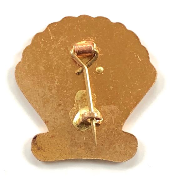 A very scarce original 'Red Island holiday camp 1956 badge'; large gilt pin badge in the form of a shell, the centre displaying a yacht in full sail, within datk blue sky and sea, with red enamel label below. Good condition, complete with original pin fittings, label with manufacturers enamel infill flaw.