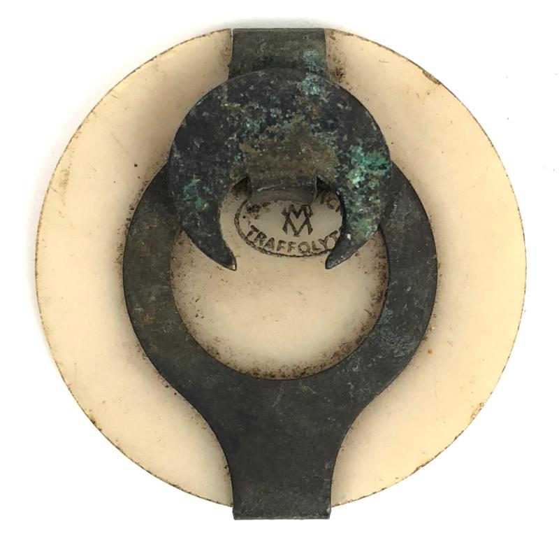 A good formica Public Service Vehicle PSV Bus Driver 's badge, low license number 'CC 16476' held in a brass holder with lapel buttonhole fitting to the reverse and maker's logo 'Metrovick Traffolyte'. Good condition, colours remain bright, some corrosion to brass.