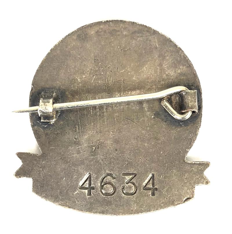 A good original circa mid 1940's into the 1950's period 'Registered Medical Auxiliary Chiropodist silver plated badge' the green enamel the centre inscribed 'National Register', the reverse impressed with official issue number '4634'. Very good condition, complete with original pin fittings, no damage to the enamel.