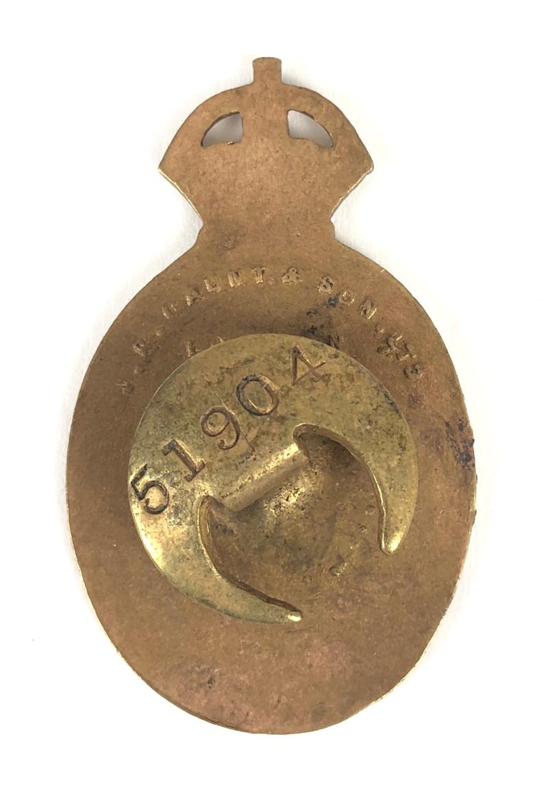 A scarce original First World War official issue 'On War Service 1915 munition workers badge', gilt brass Crowned blue enamel oval title, the centre bearing the 'Board of Ordnance' shield on white enamel ground, the reverse impressed with maker's details 'J.R.Gaunt London' and official issue number '51904'. Good condition, complete with original buttonhole fitting, minor flaws to the enamel and service wear.