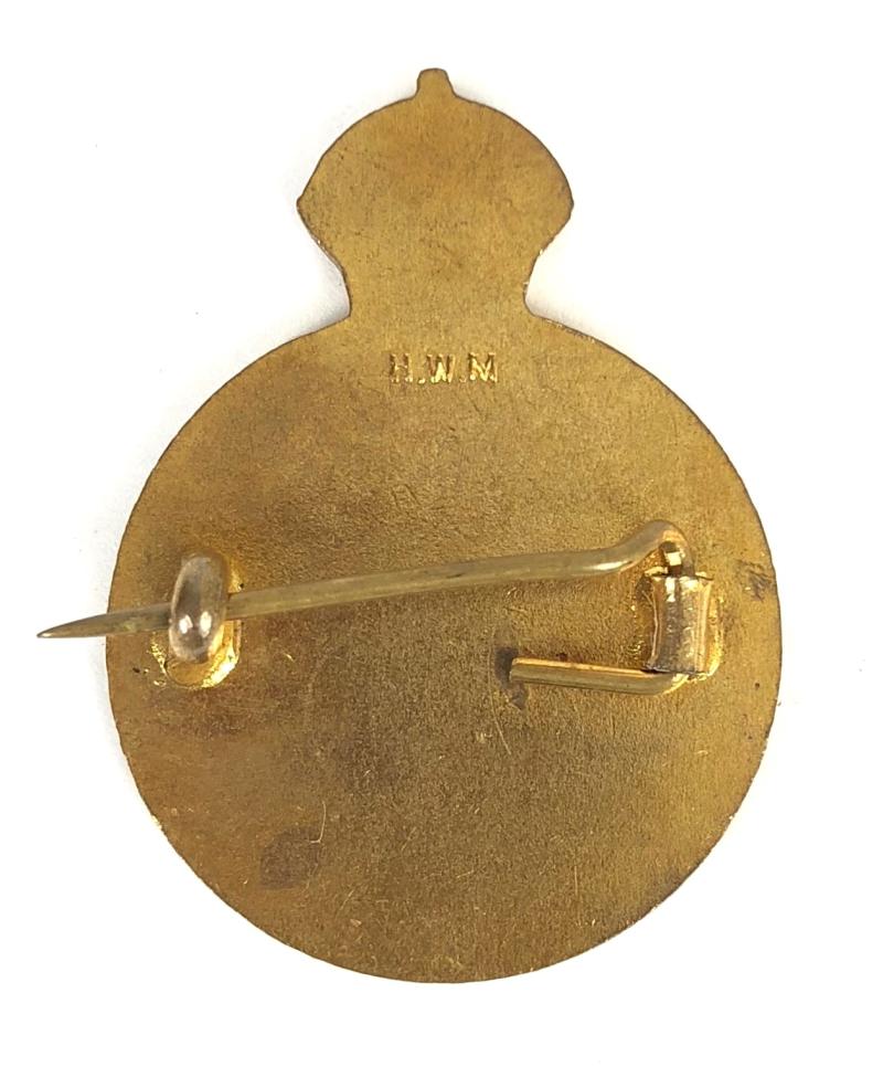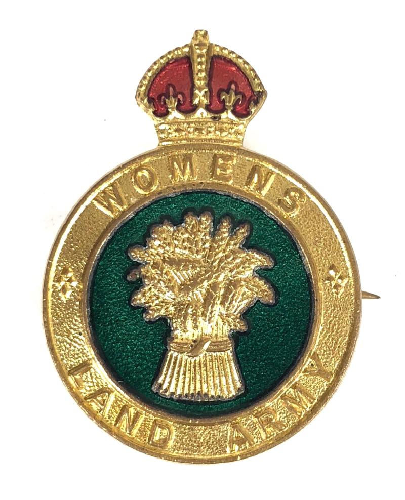 A scarce ORIGINAL Second World War period fine quality 'Womens Land Army' gilt brass badge inlaid with green enamel to central wheatsheaf and red to the Crown, the reverse impressed with maker's details 'H.W.M' (H.W.Miller Ltd Birmingham). Very good clean condition, complete with original pin fittings, no stress marks or damage to the enamel, gilt finish remains bright.