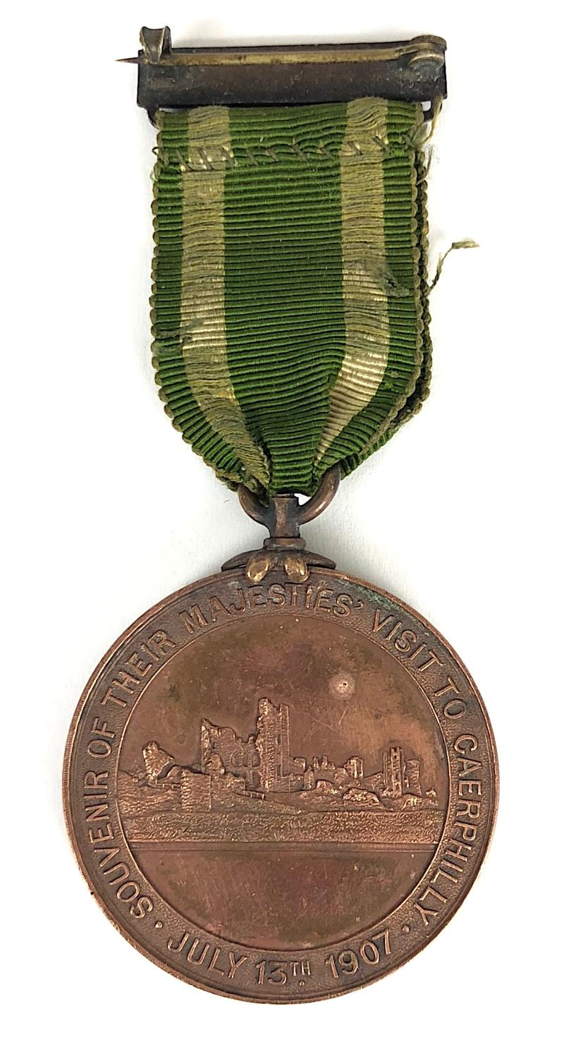 A scarce original souvenir medal for the Royal Visit to Caerphilly South Wales July 13th 1907 in the form of a heavy duty bronze meda, the obversel displaying the portraits of the King and Queen in oval frames inscribed 'King Edward VII Crowned 1902 Queen Alexandra' within a ornate design; the reverse depicting 'Caerphilly Castle' as a ruin. Good condition, complete with original green silk ribbon with 1907 suspension bar.