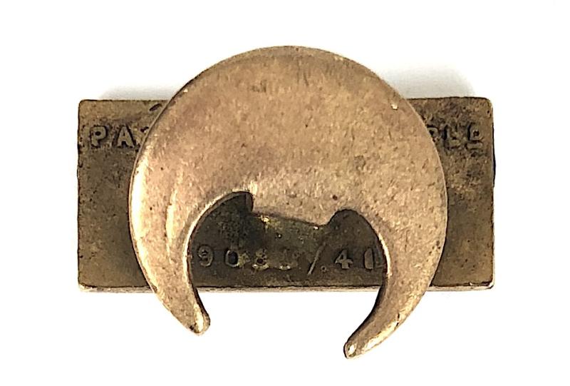 A scarce original circa wartime period small gilt brass rectangular shaped lapel badge inlaid with blue enamel, depicting a 'V for Victory' and international morse code calling sign 'dot dot dash'; the reverse impressed in relief 'PAT APPLd 9081 / 41'. Very good condition, complete with original buttonhole horseshoe fitting, no stress marks or damage to the enamel.
