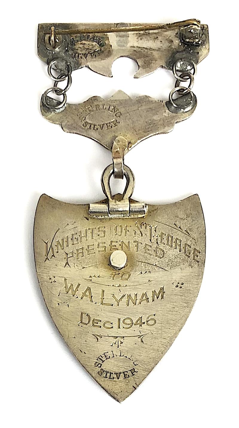 A scarce original fine quality 'Knights of St. George presentation pin badge'; ornate silver shield bearing red translucent enamel cross, mounted with a representation of 'Saint George and the Dragon', inscribed to reverse 'KNIGHTS OF ST GEORGE PRESENTED TO W.A.LYNAM DEC 1946'. Very good condition, complete with pin fittings, hook an old replacement, no enamel loss.