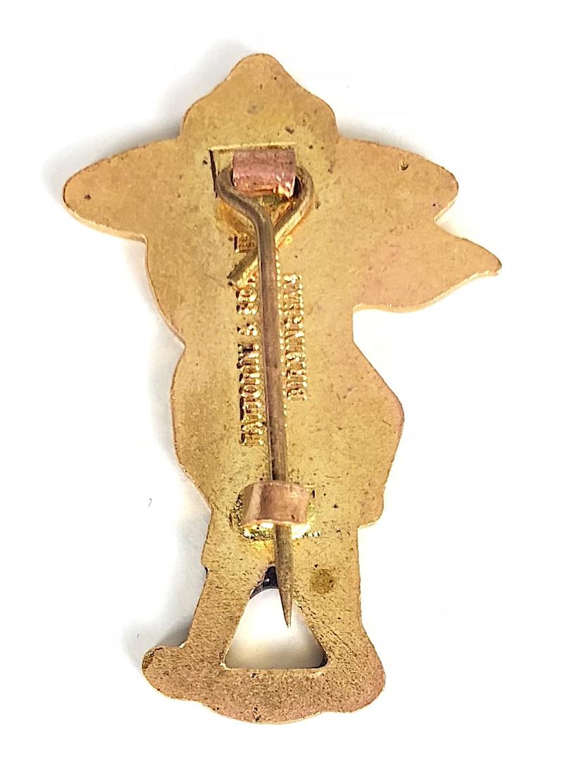 A scarce original 'Robertson's golly scout promottional badge', this is a rather well set golly with mouth moved to right, fawn bush hat, small 'Boy Scout fleur-de-lis emblem' to the flag, dark blue jacket, white waistcoat with advertising slogan 'Golden Shred', the reverse impressed with maker's details 'FATTORINI & SONS LTD BRADFORD WORKS BIRMINGHAM'. Very good condition, complete with original pin fittings, no stress marks or damage to the enamel, gilt finish remains bright.