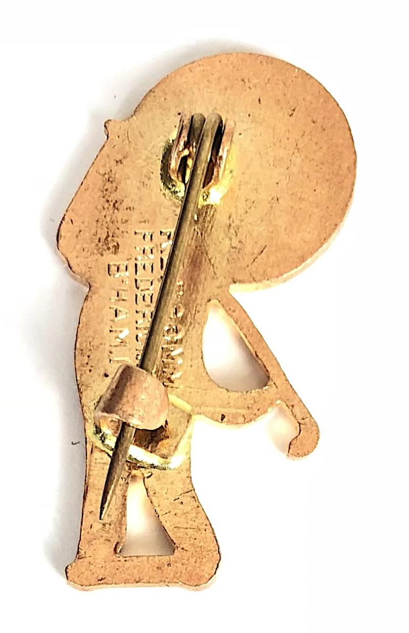 A good original post war circa 1950's period 'Robertson's Golly golfer promotional badge', this example with eyes down, large pupils, bright blue coat, blue hands, red feet and white waistcoat which bears the advertising slogan 'Golden Shred'; the reverse impressed with maker's details in relief 'R.E.V.GOMM FREDERICK ST B'HAM.1' Very good condition, complete with original pin fittings, no stress marks or damage to the enamel, gilt finish remains bright.