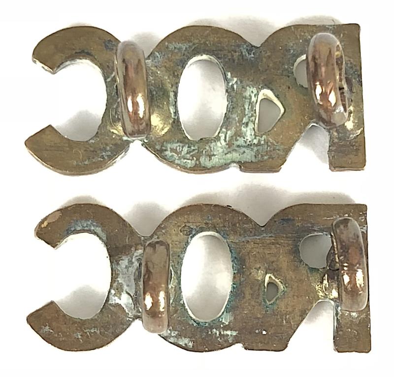 A scarce post-1941 period 'Royal Observer Corps officer's small matching pair of ROC brass collar / greatcoat shoulder strap title badges'. Very good condition, retaining original loop fittings to reverse.