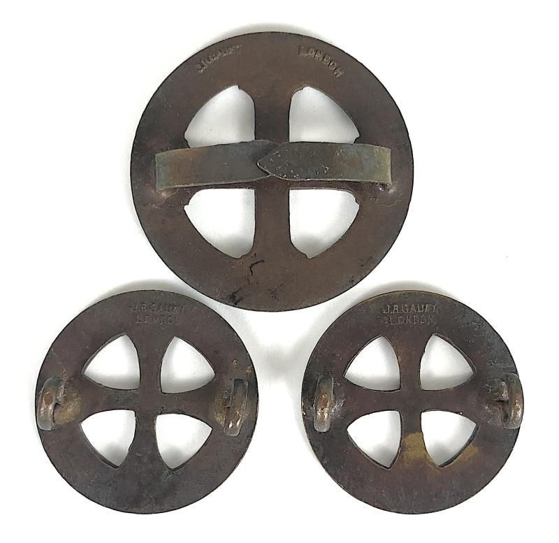 A scarce original Second World War period 'Women's Transport Service First Aid Nursing Yeomanry cap and matching collar badges'; die-cast bronze circular example on blades and loops, the reverse impressed with maker's details 'J.R.GAUNT LONDON'. Very good condition.
