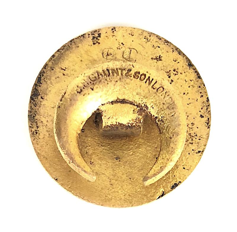 A scarce original First World War 'On War Supplies S.M.W Company Limited 1915 identification badge', circular gilt brass example bearing yellow enamel title surround with company name to centre on green enamel ground; the reverse impressed with maker's details 'J.R.GAUNT & SON LONDON' and with engraved low issue number '53'. Very good condition, complete with original buttonhole lapel fitting, no damage to the enamel.