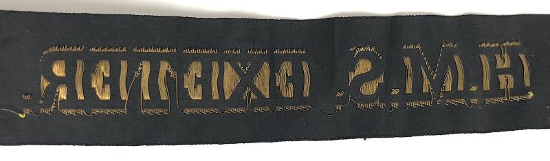 A rare ORIGINAL circa 1929 - 1939 period 'H.M.S. Exeter cap tally ribbon', gold bullion embroidered lettering with small dots on extra long silk ribbon. Very good condition.