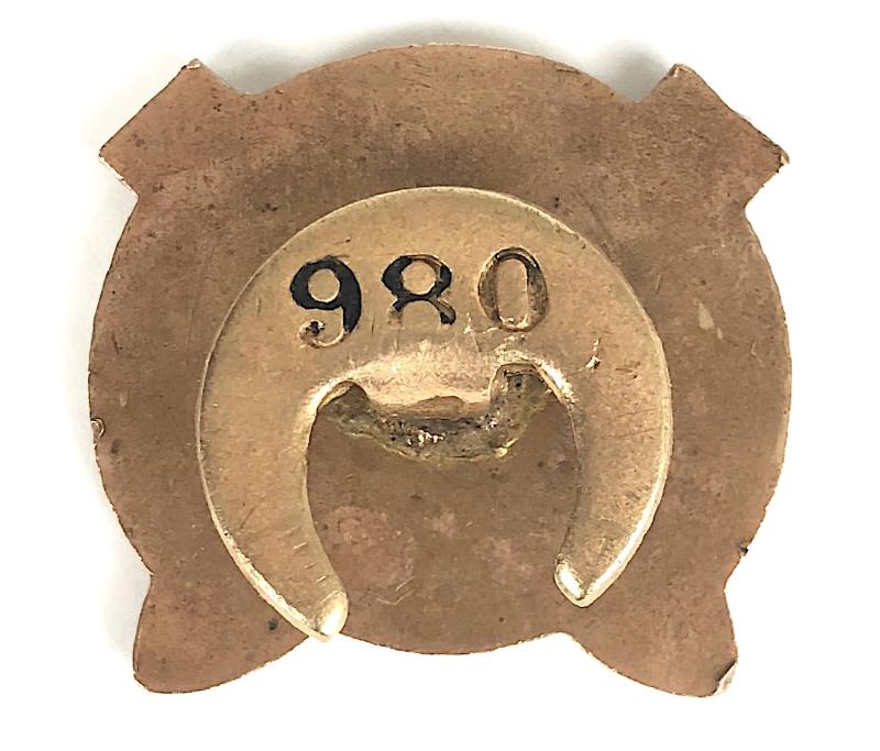 A very scarce original short-lived wartime period 'Royal Ordnance Filling Factory war workers identification badge'; in the form of crossed shells within 'Front Line Duty' red horseshoe title, superimposed RAF style aircraft roundel, the centre bearing the initials 'ROF', the reverse impressed with official issue number '980'. Good condition, retaining original buttonhole fitting, enamel intact, minor service wear.