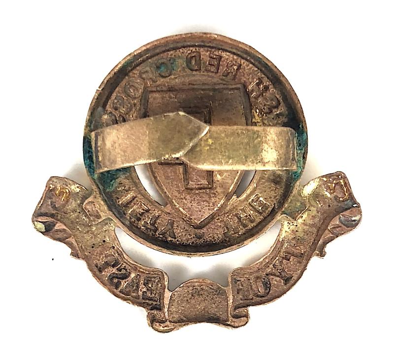 A scarce original First World War period 'British Red Cross Society County of East Lancashire Detachment 35 cap badge'; a gilt and enamel example the reverse with original two blade fittings. Very good condition, no damage to enamel, gilt finish remains bright.
