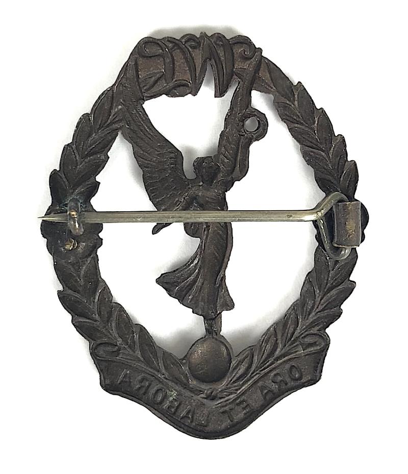 A very scarce original post 1934 short lived 2nd pattern issue 'Womens Legion uniform cap badge'; large die-stamped bronzed laurel sprays resting on Laitin scroll 'ORA ET LABORA' (pray and work) joined at the top by 'WL' with rose on each side of the laurel; winged figure on Globe to voided centre. Very good condition, compete with original substantial pin fittings.