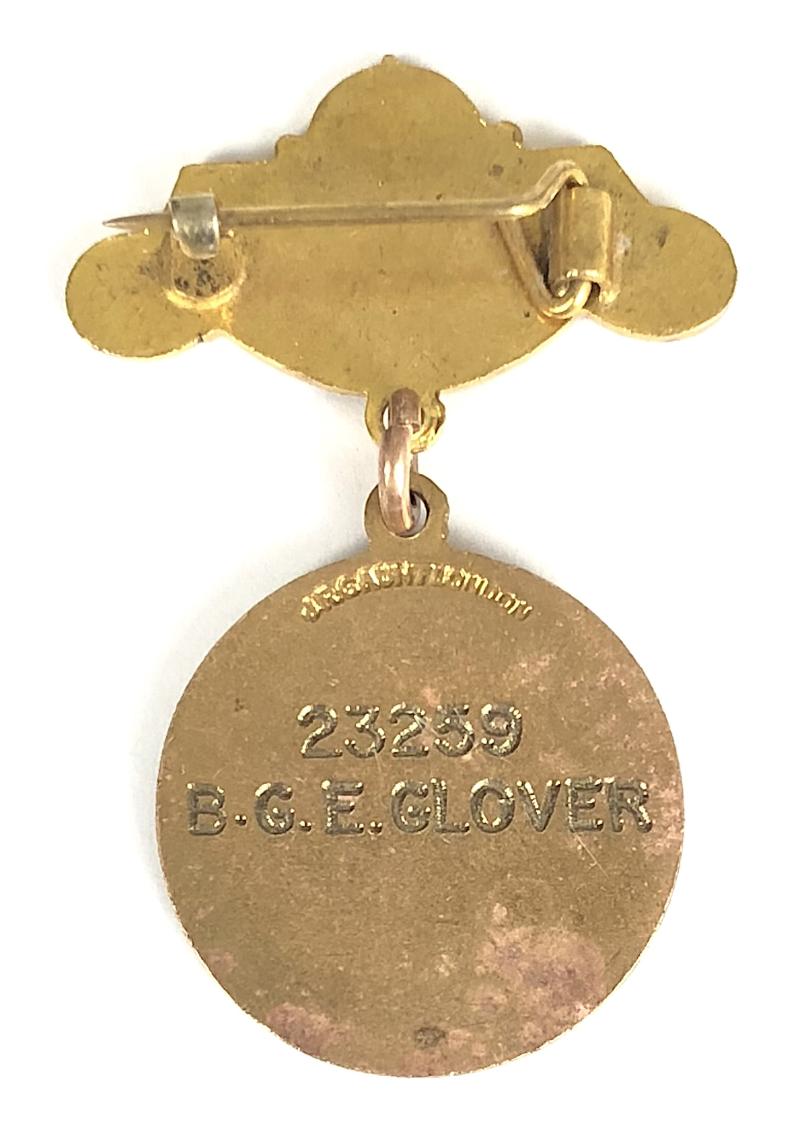 A good original 'British Red Cross Society County of Cornwall gilt and enamel badge', the reverse impressed with maker's details 'J.R Gaunt London' and inscribed '23259 B.G.E.GLOVER'. Very good condition, no stress marks or damage to the enamel.