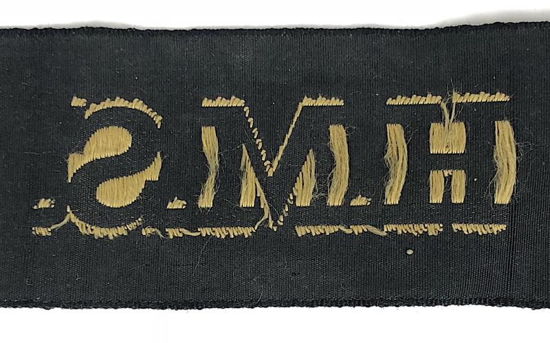 A good original circa Second World War period Royal Navy 'His Majesty's Ship' cap tally'; embroidery gold wire 'H.M.S.' on full length ribbon. Very good used condition. Length approx 95mm.