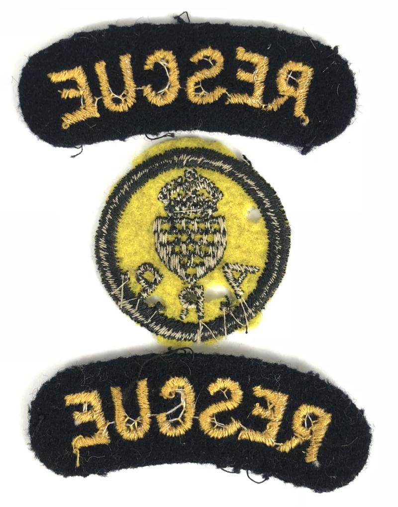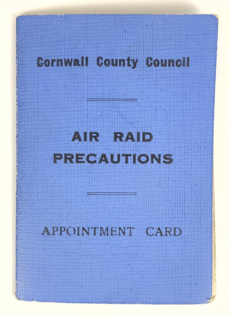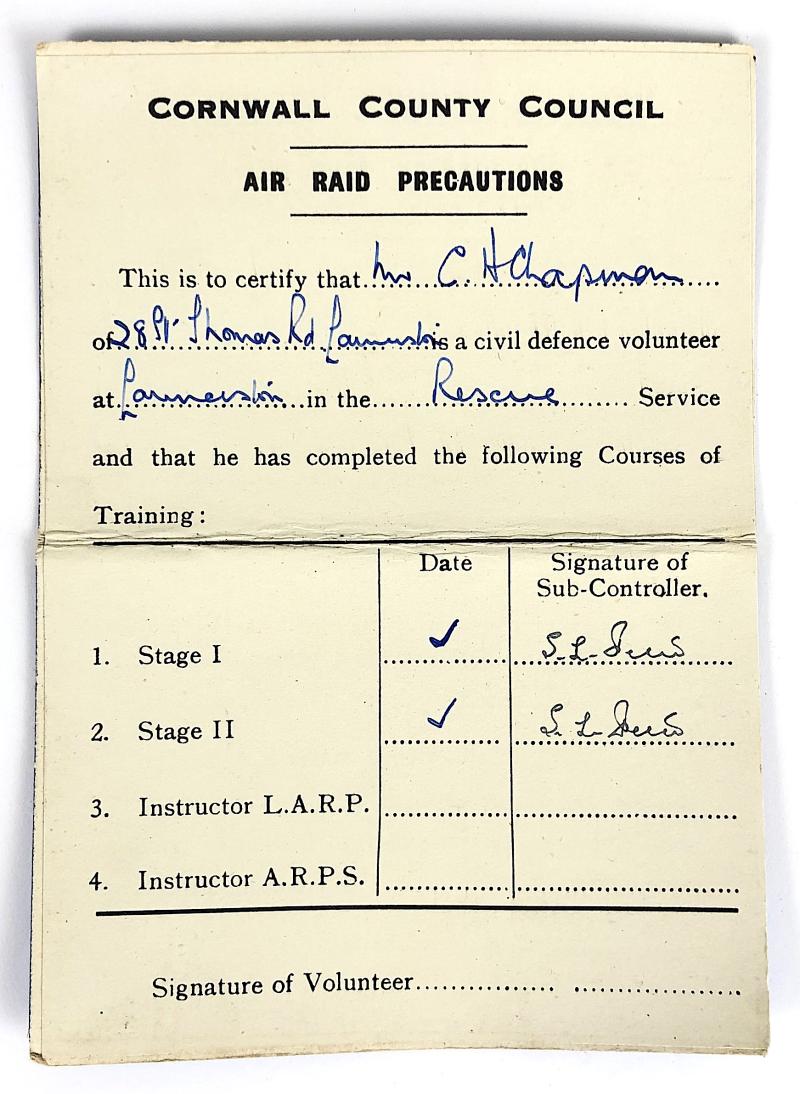 A scarce original circa 1941 'Cornwall Area Civil Defence Rescue Service felt cloth uniform and hat badges', in the form of a large uniform pocket bearing felt circular cloth gold embroidered Crown over CD to the centre, together with a felt cloth CORNWALL area curved title, pair of rescue titles and ARP post 1941 cap badge (badly mothed) all others in good condition, together with his Cornwall County Council Air Raid Precaucautions Appointment Card with his name and address stating he was a Civil Defence volunteer at Launceston in the Rescue Service and that he has completed the following Courses of Training.