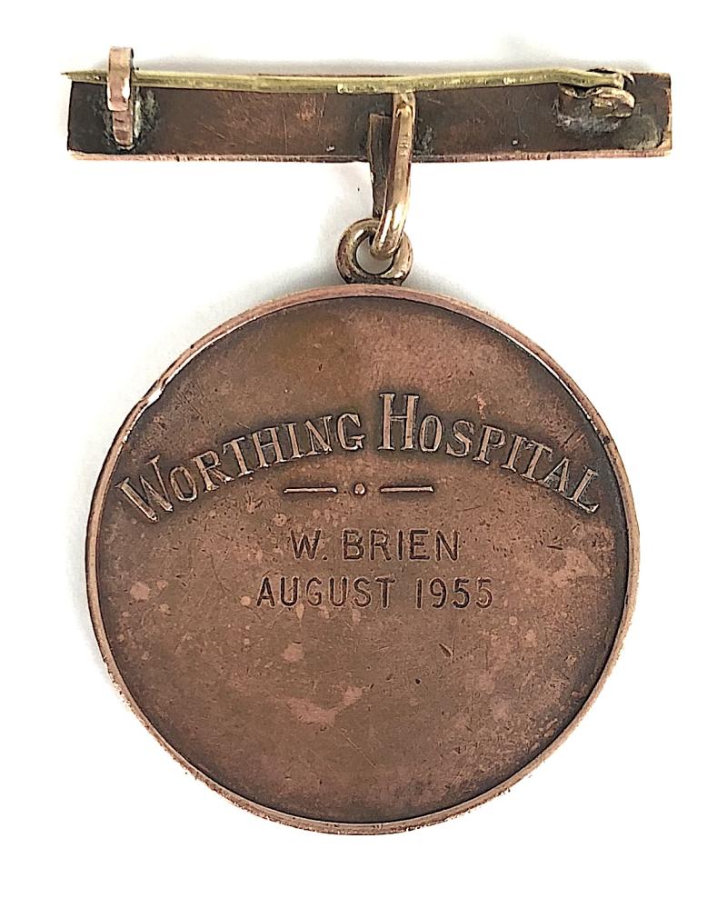 A good original circa 1955 period 'Worthing Hospital award badge'; large coppery brass disc bearing embossed ornate cross, inscribed around the outer edge 'UNBOUNDED COURAGE AND COMPASSION JOINED and suspended from a Worthing Hospital pin bar; the reverse inscribed to the recipient 'W.BRIEN AUGUST 1955'. Good condition, complete with original pin fittings, minor service wear.