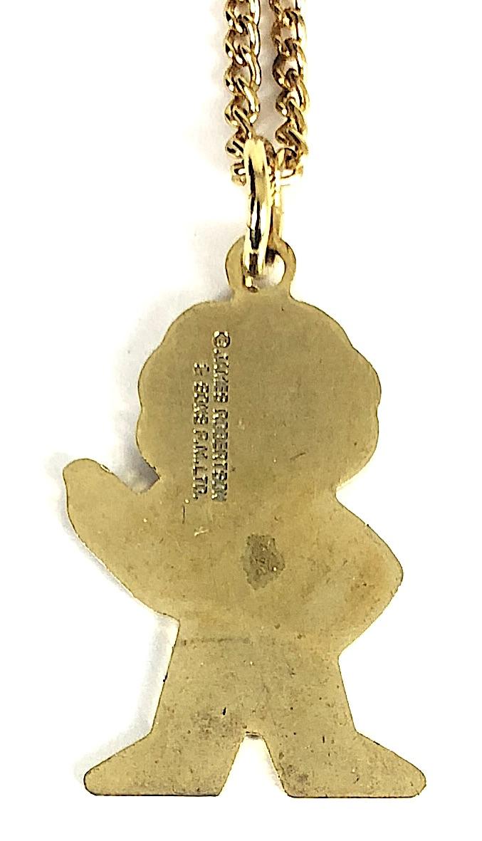 A scarce original circa 1980's 'Robertson's Golly standard pendant promotional acrylic badge and chain', miniature size gold chromium plated example, solid area between arm and cheek; the reverse impressed with maker's details '©James Robertson & Sons P.M. Ltd.' Very good condition, complete with original suspension ring and chain, no damage to the painted enamel finish.