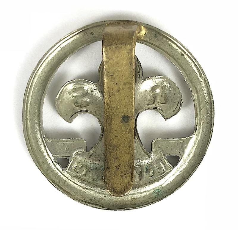 A good original British made pre-1964 issue 'Rover Scouts green beret badge'; circular die-stamped nickel plated example displaying an arrowhead to voided circle 'R S' instead of the stars with 'Boy Scouts' scroll below. Very good condition, complete with original slider fittings.
