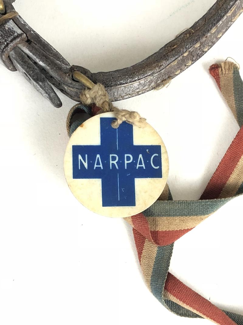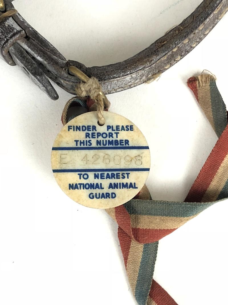 A rare Second World War period 'National Air Raid Precautions Animals Committee leather dog collar bearing 'NARPAC celluloid identity disc with printed Blue Cross', the reverse impressed with official Registration Number 'E 426098' and 'Finder Please Report This Number To Nearest National Animal Guard'. Good condition, complete with red, white and blue patriotic ribbon.