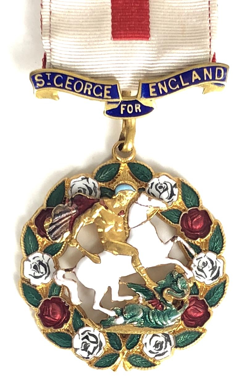 A scarce original circa 1930's period full size 'The Royal Society of St.George For England Order'; fine quality ornate unmarked gilt and enamel example, the centre mounted with 'Saint George and the Dragon' device, suspended from blue enamel suspension title bar by a cream silk ribbon with Red Cross and gilt rose. Very good clean condition, complete with original single pin fitting, minor red enamel defect to cloak, .