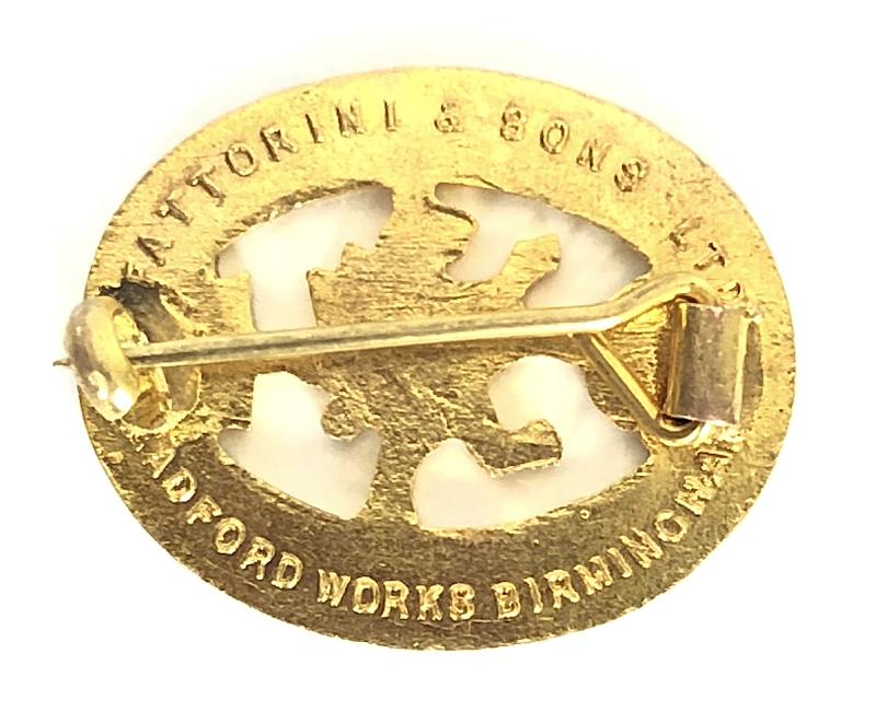 A scarce original circa 1930's period 'National Federation of the Women's Institutes pin badge', gilt brass green enamel oval, the fretted centre bearing a red 'Welsh Dragon', flanked by enamel rose and Canadian maple leaf, with Welsh inscription 'FY NGWLAD A'M CARTREF' which translates (For Home and Country); the reverse impressed with maker's details 'FATTORINI & SONS LTD BRADFORD WORKS BIRMINGHAM' an address format used between 1933–1948. Very good condition, complete with original pin fittings, no damage to the enamel, gilt finish remains bright.