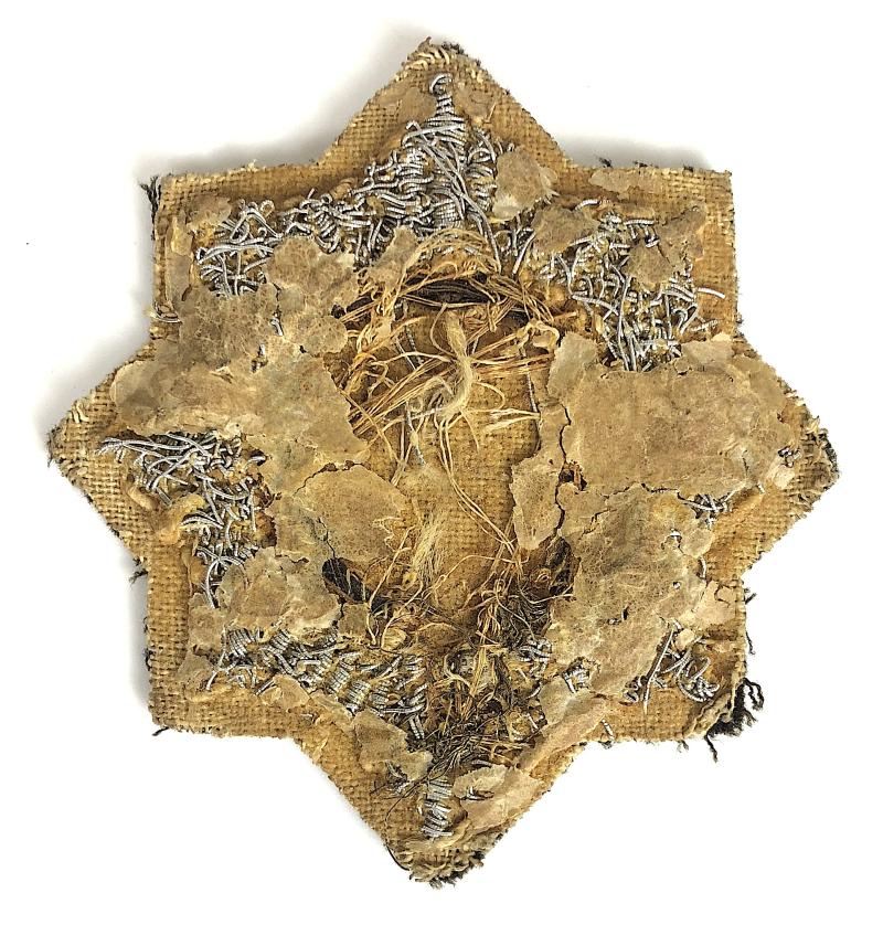 A scarce original pre 1943 period 'Shanghai Municipal Police blazer badge'; large silver wire eight pointed star mounted with gilt wire strap inscribed 'Shanghai Municipal Police'; the centre with multi coloured woven flags of the nations represented in this International Settlement, set on the motto 'Omnia juncta in uno' (All joined together into one), the reverse with partial brown paper backing. Good condition, minor age wear.