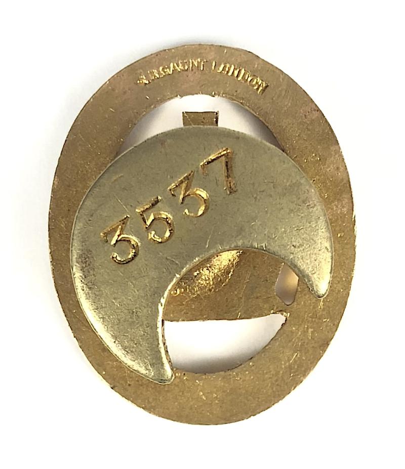 A good original early issue First World War period 'National Reserve Wilts numbered badge', small pattern blue enamel oval title, gilt Crown to voided centre, the reverse impressed with maker's details 'J.R.Gaunt London' and with official issue number '3537'. Very good condition, complete with original buttonhole fitting, no enamel loss, minimal service wear.