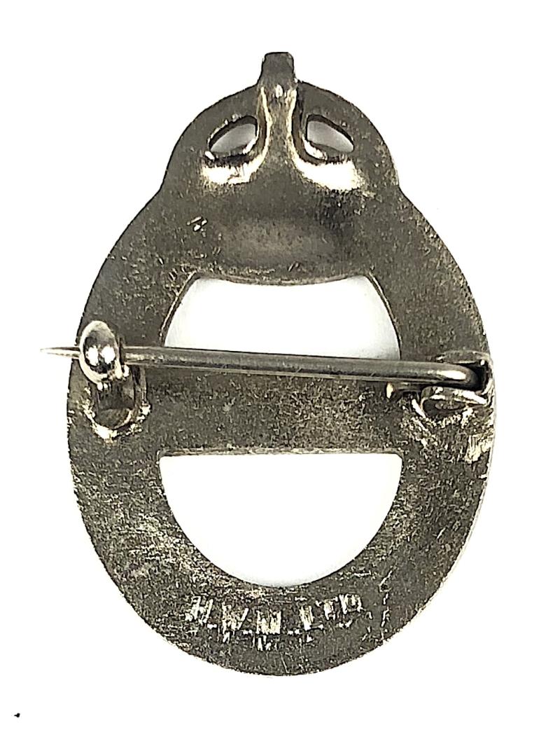 A scarce original post 1942 wartime period 'Local Air Raid Precautions Civil Defence Instructor pin badge', nickel plated Crowned horseshoe title, inlaid with red enamel, 'Instructor' title bar across voided centre; the reverse impressed with maker's details 'H.W.M. Ltd' (H.W. Miller Ltd). Very good condition, complete with original pin fittings, no damage to the enamel, an excellent example.
