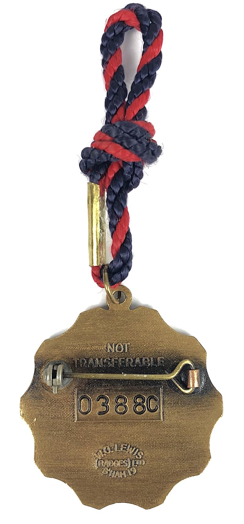 A scarce original '2014 Newbury Racecourse Annual bronzed pin badge' depicting a horse and jockey, the reverse impressed with maker's details 'W.O.Lewis (Badges) Ltd B'Ham 19', official issue number '388 C' and 'Not Transferable'. Very good clean condition, complete with original pin fitting and cord.