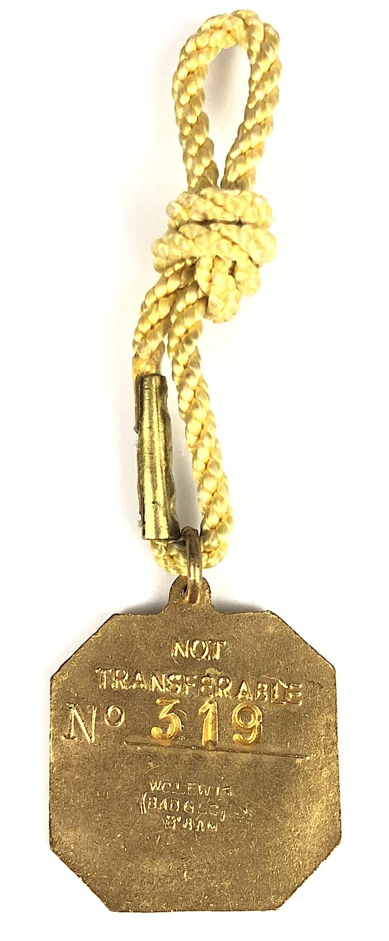 A scarce original gentleman's '1953 Ascot Iron Stand gilt and enamel badge' the reverse impressed with maker's details 'W.O.Lewis (Badges) Ltd B'Ham', official issue 'No 319' and 'Not Transferable'. Very good clean condition, no damage to the enamel and complete with original cord.