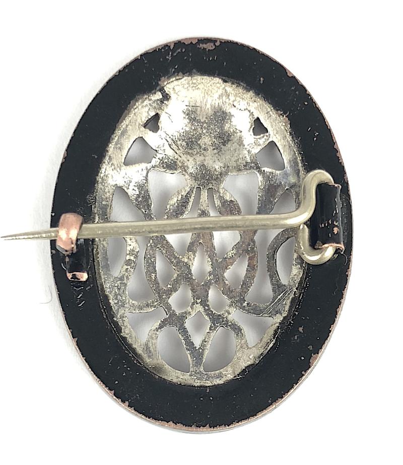 A scarce original end of the First World War period tribute badge 'For Voluntary War Work In India 1914 to 1919', oval blackened brass title surround, the fretted central device depicting the 'National Flower of India' a Lotus (Nelumbo nucifera) in silver coloured floral decoration. Very good condition, complete with original pin fittings.