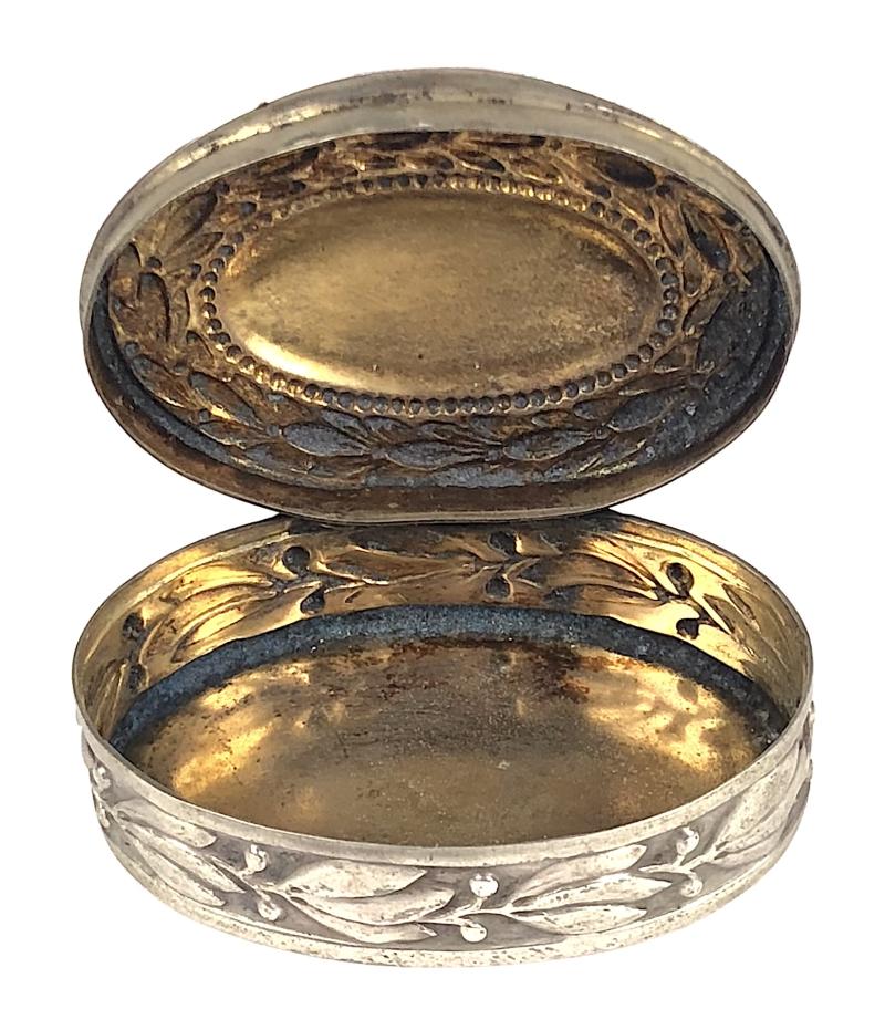 A scarce original early period 19th century small ornate continental silver oval gilt lined snuff box, impressed to the sides and lid with Laurel Leaf decoration, the base impressed '800' with a Crown and unidentified import makings, the top inscribed 'H.M.S. ISIS' with motto 'QUOD EST MANET' (That which is remains) and a large 'V'. Very good condition, hinge lid opening in good working order.