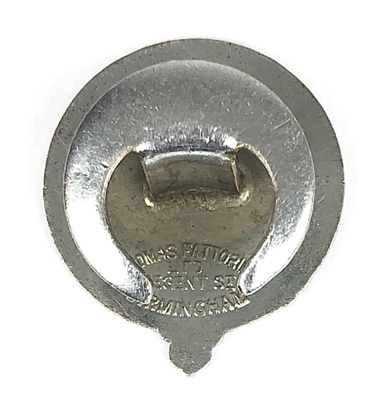 A rare original Second World War period 'Park Gate Iron & Steel Co Ltd air raid precauctions home front badge'; small chromium plated black enamel title strap 'ARP' to centre on blue enamel ground; the reverse impressed with maker's details 'Thomas Fattorini Ltd Regent St. Birmingham'. Very good condition, complete with original buttonhole lapel fitting, no stress marks or damage to the enamel.