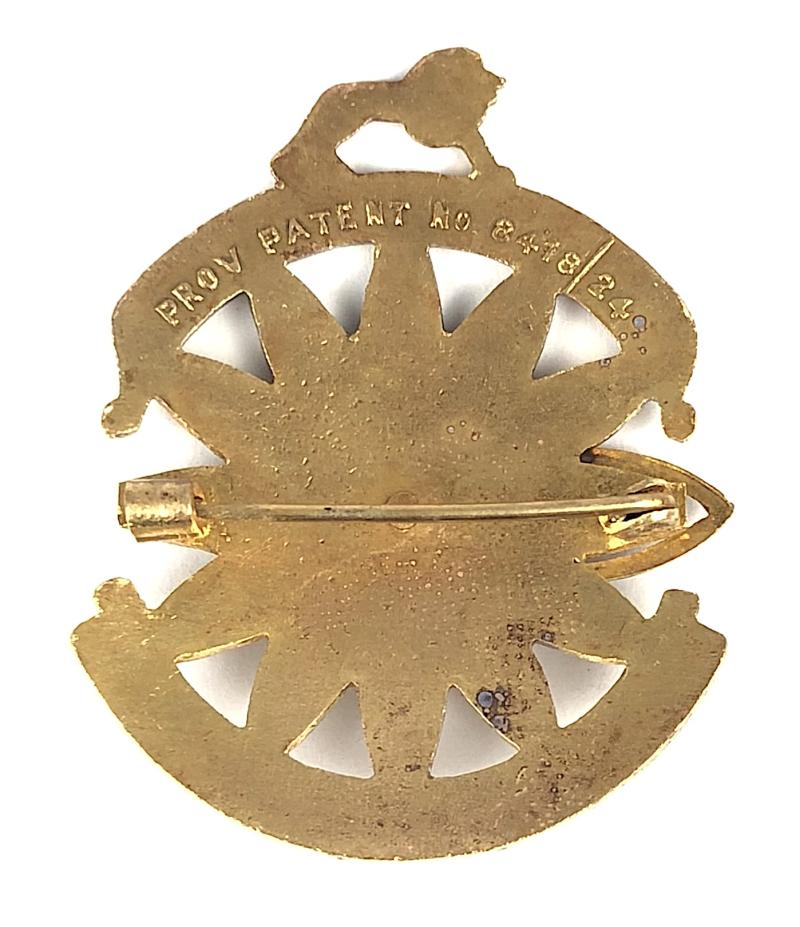 A scarce original 1924 period '1924 British Empire Exhibition pin badge on original display card' large gilt brass example inlaid with red, white and blue enamels, in the form of a flower head, depicting the names of the Colonies from around the world participating in the exhibition in petal form with rotating hand as a pointer, mounted by the 'Wembley Lion' resting on curved top scroll 'British Empire' with 'Exhibition 1924' below; the reverse impressed with details in relief 'Prov.Patent No 8418/24'. Very good condition, complete with original pin fittings, minimal damage to the enamel, gilt finish remains bright.