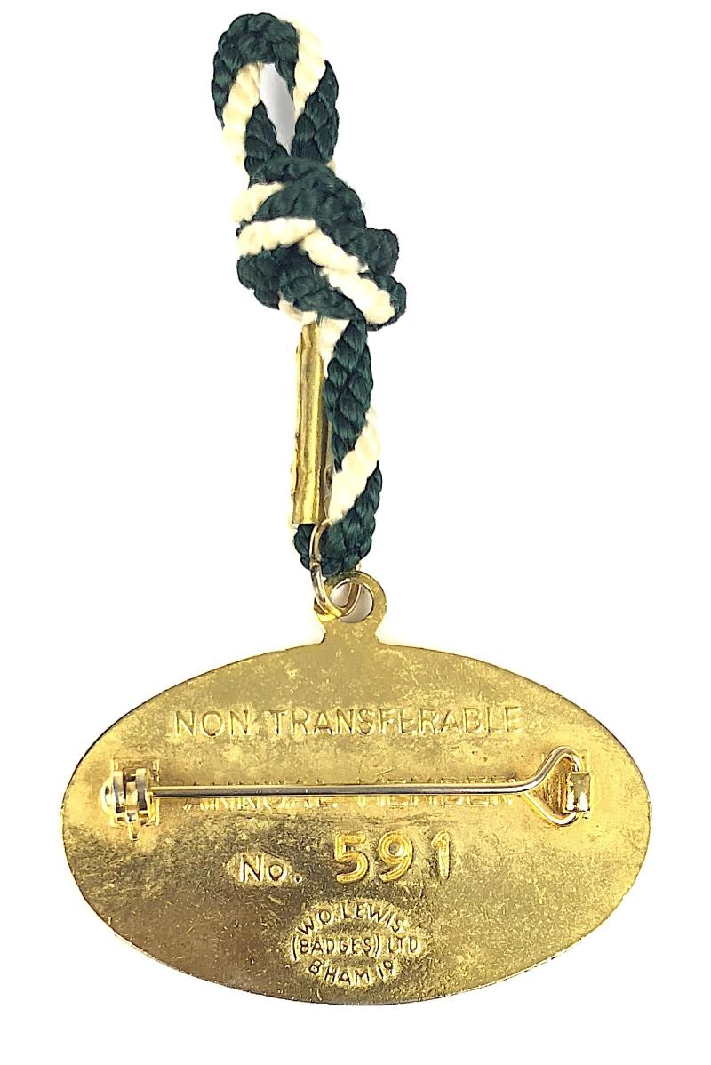 A good original well designed '200l Newmarket Racecourse Annual Membership badge' large gilt oval example with green enamel title surround depicting an embossed scene of three racing horses and jockeys, the reverse impressed with maker's details 'W.O.Lewis (Badges) Ltd B'Ham 19', official issue number '591' and 'Not Transferable'. Very good clean condition, complete with original pin fitting and cord.