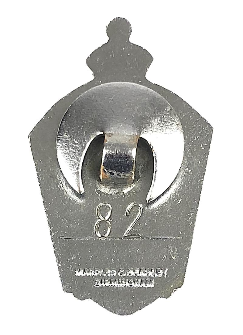 An extremely rare original Second World War period 'Guy Motors Limited air raid precautions badge'; in the form of a large chromium plated Crowned shield bearing embossed 'A.R.P' to top half on seeded ground and large 'G' with 'Guy Motors Limited' logo inlaid with red enamel to the lower; the the reverse impressed with maker's details 'Marples & Beasley Birmingham' and official low issue number '82'. Very good condition, complete with original buttonhole fitting, enamel perfect.