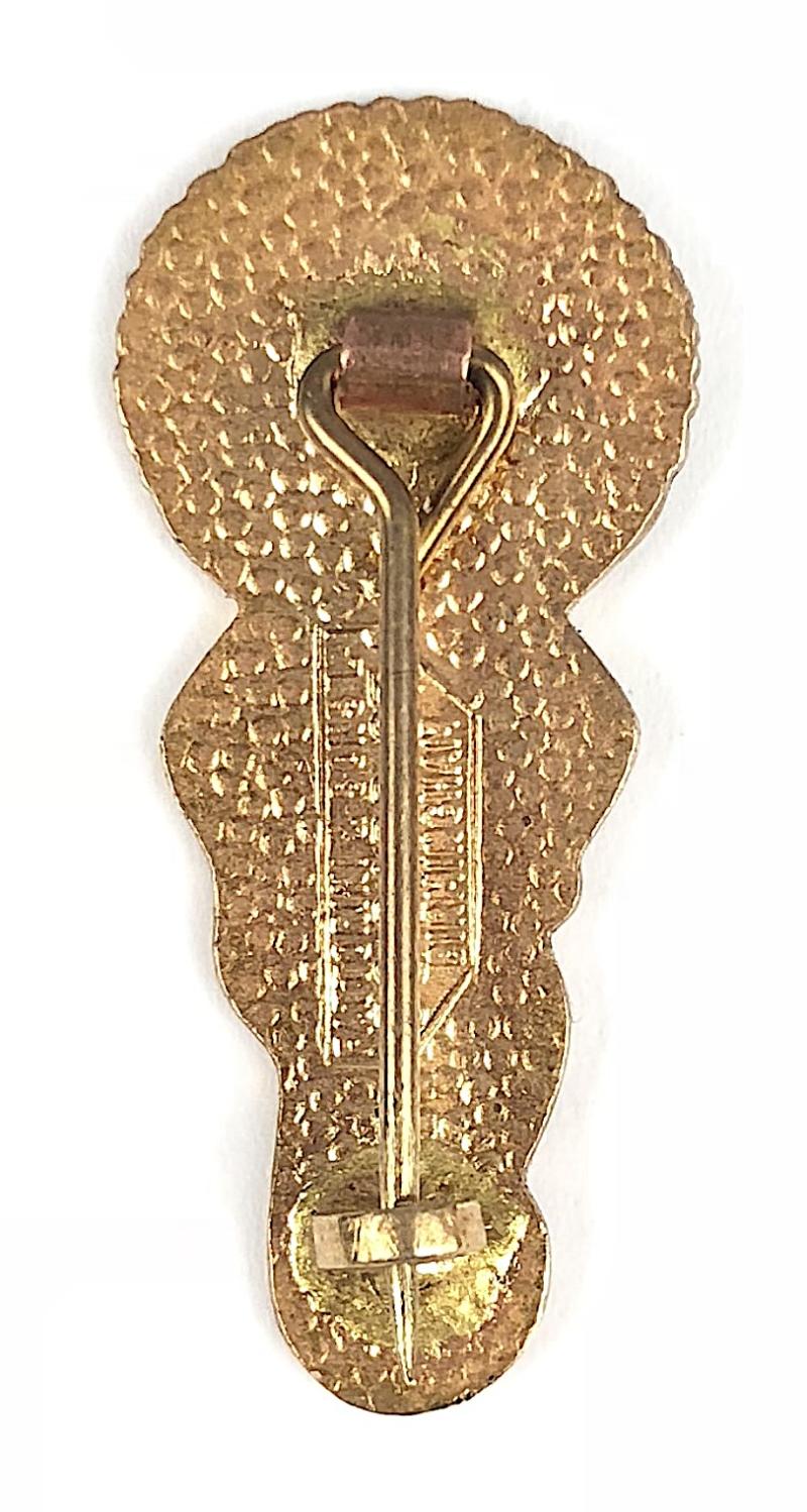 A scarce original circa 1950's 'Robertson's standard Golly promotional badge' wearing a bright blue coat, white waistcoat with pockets and displaying the advertising slogan 'Golden Shred', the reverse impressed in relief with maker's details 'FATTORINI & SONS Ld 36 BARR ST. BIRMINGHAM' in a triangle, within raised bobble pattern surround. Very good condition, complete with original pin fittings, no damage to the enamel, normal manufacturers flaw to arm, gilt finish remains bright.