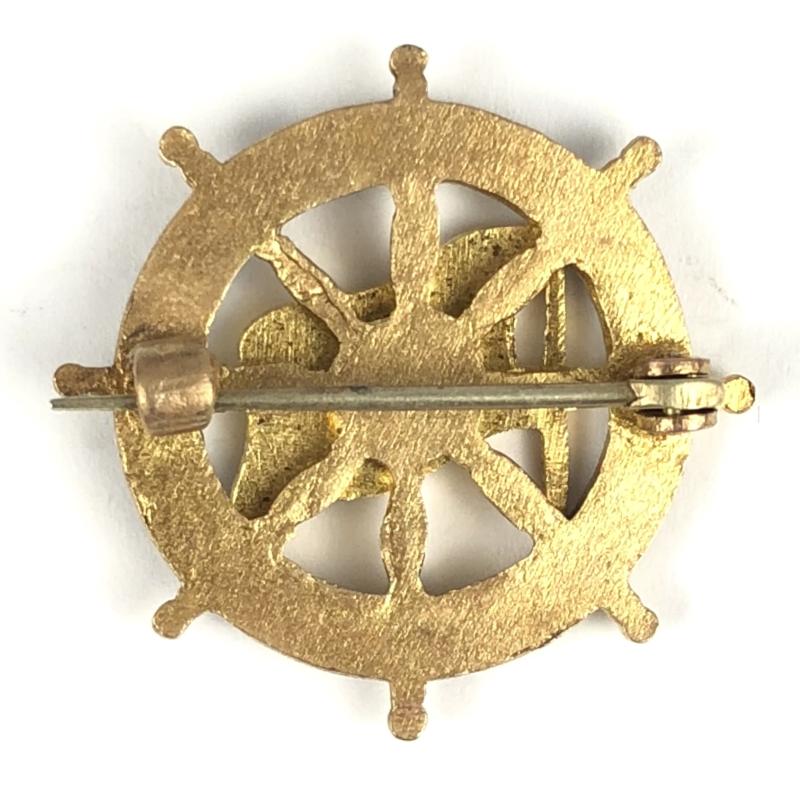 A scarce original vintage period 'HMT Huntsgreen Shipping Line gilt and enamel pin badge', the 'Orient Line' enamelled flag mounted to the centre of a ship's wheel. Very good condition, complete with original pin fittings, no damage to the enamel, an excellent example.