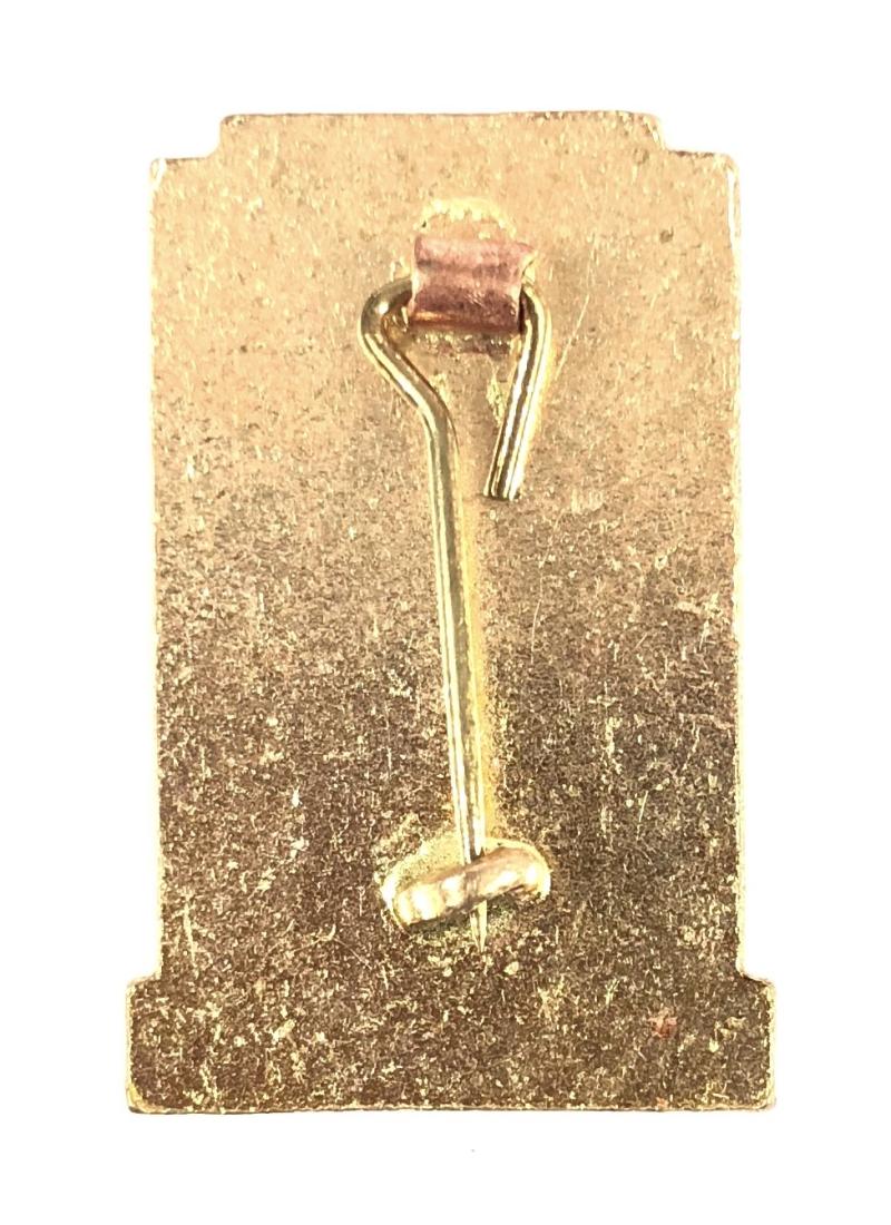 A rare original 'Butlin's 1956 Mosney holiday camp badge'; gilt example displaying a 'Butlin's Redcoat' in her distinctive blazer on green enamel background. Very good condition, complete with original pin fittings, no damage to the enamel. An excellent example.