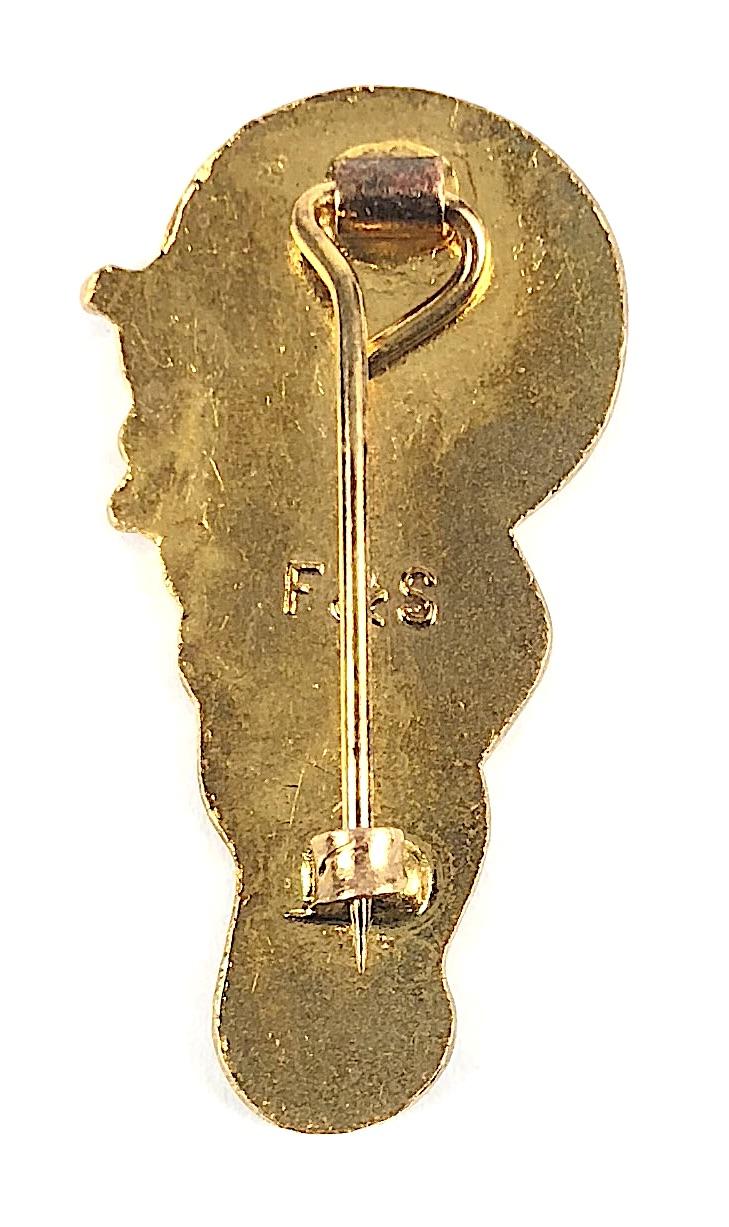 A good original post war circa 1950's period 'Robertson's Golly bagpiper badge' with white waistcoat, light blue coat and displaying the advertising slogan 'Golden Shred' in raised metal on golden translucent enamel bagpipe bag, the reverse impressed in relief with maker's details 'F&S' (Fattorini & Sons). Very good condition, complete with original pin fittings, no stress marks or damage to the enamel.