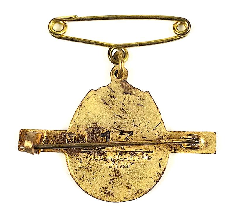 A good original '1972 - 1973 Plumpton Racecourse horse racing club badge', gilt and enamel example with official low issue number '17', the reverse impressed with maker's details 'W.O.Lewis (Badges) Ld B'Ham'. Very good condition, complete with both original pin fittings, no stress marks or enamel loss, gilt finish remains bright.
